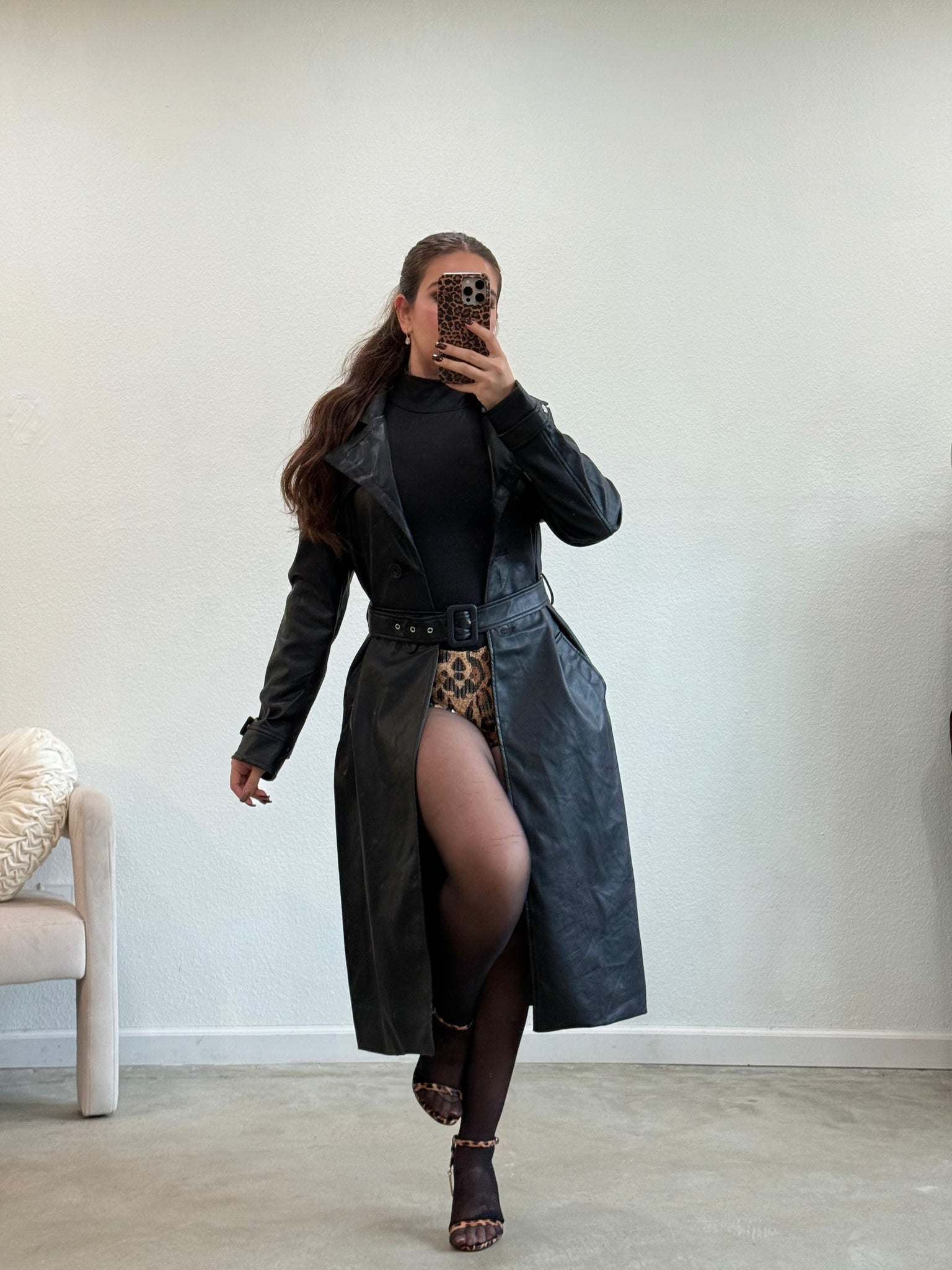 Elevate your outerwear with this maxi faux leather trench coat crafted from smooth, quality faux leather, offering a structured silhouette, multiple leg slits for easy movement and full length design.
